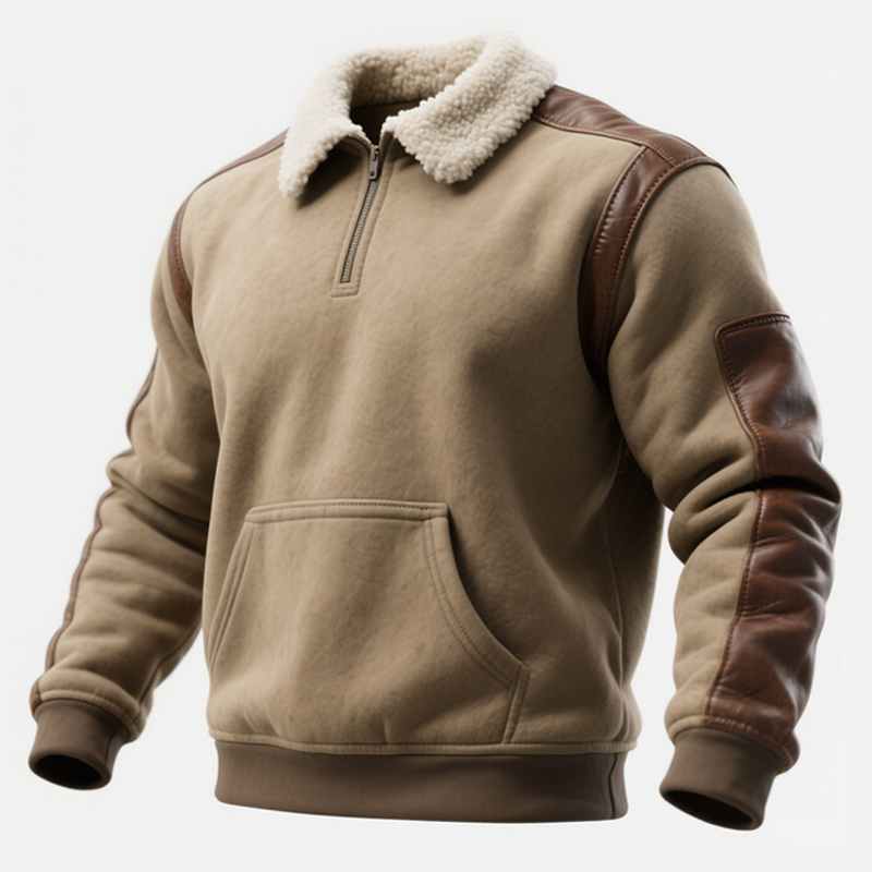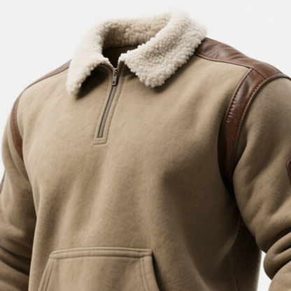 • Design Elements: Faux fur collar, leather shoulder and elbow patches, half-zip closure